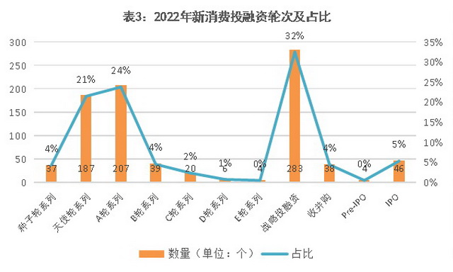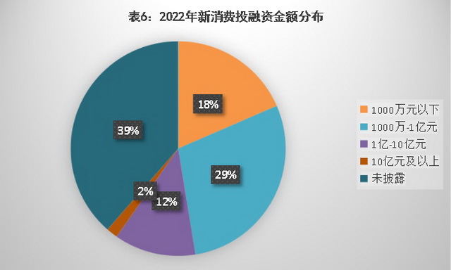 分月度来看,2022年新消费投融资数量呈V字型。考虑到2月春节假期和10月国庆长假,这两个月的投融资数量处于低位是需要理性看待的。排除长假影响,整体而言,1-3月投融资数量处于相对高位;受疫情等因素影响,4-9月投融资数量下跌并持续遇冷;10月下旬以来,消费投融资出现回暖迹象,反映到数据上,11月-12月迎来连续2个月小幅上涨。
