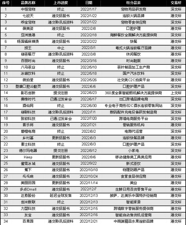 除了成功上市的公司,还有34个新消费项目在积极谋求上市,但并不顺利。其中,有8个项目上市终止,1家中止,达美乐披萨中国特许经销商达势股份更是在IPO前紧急叫停。