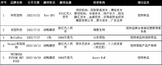 从融资轮次来看,2022年宠物企业扎堆上市,路斯宠物、源飞宠物、天元宠物先后上市;中恒宠物(已终止)、乖宝宠物先后递交招股书;并有帅克宠物与东方证券签订辅导协议,拟A股上市,IPO进程更近一步。