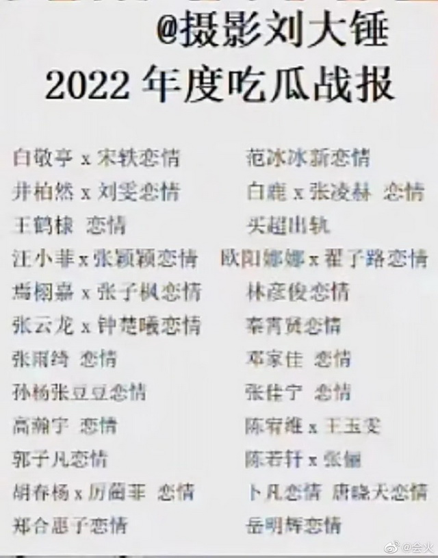 前几日,有网友总结了狗仔刘大锤这一年的“战绩”,在名单中我们能看到,这一年被曝出绯闻的艺人很多。因此,有不少网友表示2022年是明星们的“恋爱元年”。
