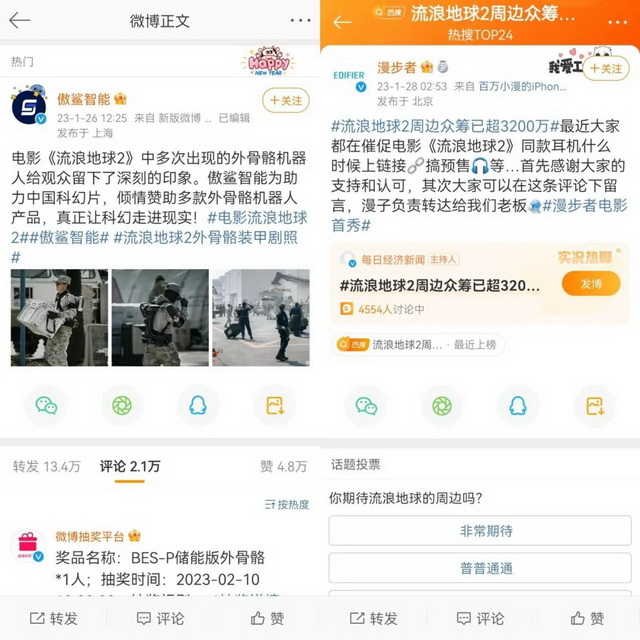 除了对电影官方周边衍生品的支持和讨论,不少《流浪地球2》的相关品牌与公司也纷纷参与其中。机器人科技公司傲鲨智能在微博上发起了外骨骼抽奖,获得超过10万的转发;有着电影中挖掘机原型的徐工集团也发起了同款模型抽奖,让无数观众了解了这个低调的公司;就连负责电影中耳机制作的漫步者,也被网友催促着“快点上同款”。