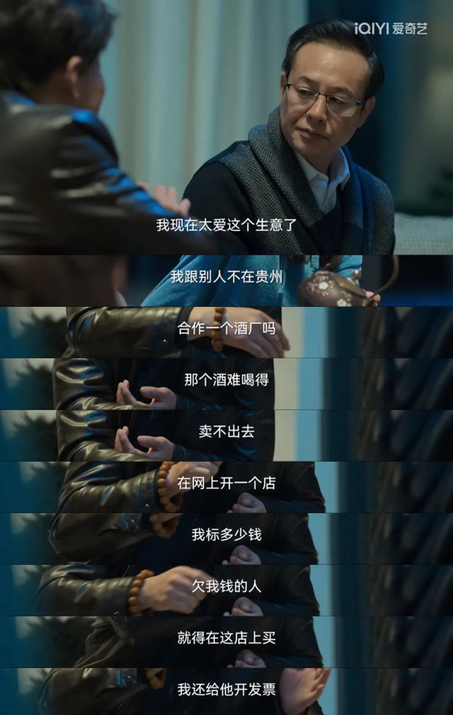 在剧集中,提及茅台镇酒时的剧情设计,成为茅台镇人最不想看到的“带货内容”——剧中黑道大哥高启强手下的“黑派人物”刀哥唐小龙,为了给自己经营的非法高利贷业务披上一个合法外衣,便和别人在贵州合作了一个酒厂,然后又在网上开了一个店,在他放出的高利贷中,正常的利息都被堂而皇之地写进了借款合同,对于那些不能写进合同的“非法利息”,就通过让借款人到网上他的店铺去买高价酒的方式收取,借此来进行“洗白”。