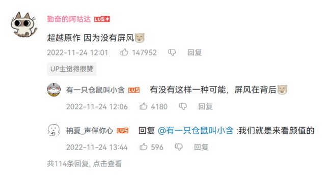 比如在前文提到的“无屏风表演《口技》还原文言文”这期视频中,他翻白眼、浮夸动作等处处可见,而网友对此评价“UP让我在末日小说里看到的每一只丧尸都有了脸”,“看来屏风确实是必要的,要不表演什么都成了纯喜剧”,“超越原作 因为没有屏风”……