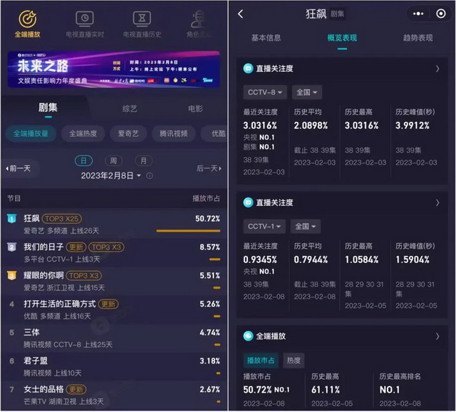 真正的爆款,⼤部分指标都是名列前茅的。据酷云EYE数据显示,《狂飙》的全端播放量突破50亿,也是单日全端播放量首次突破3亿。