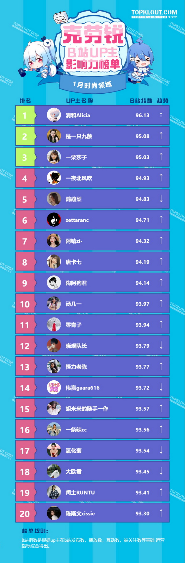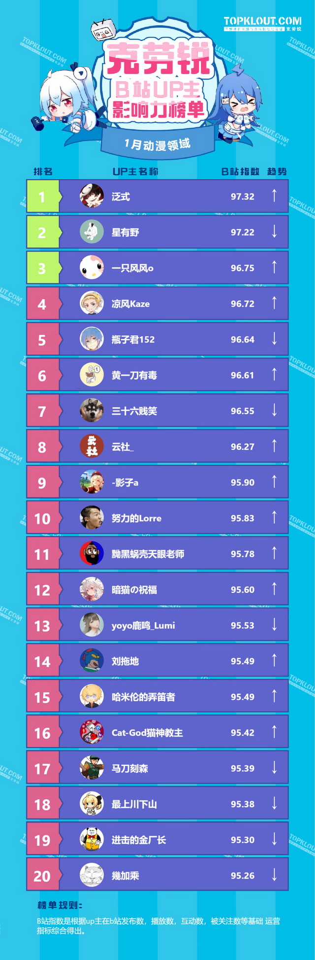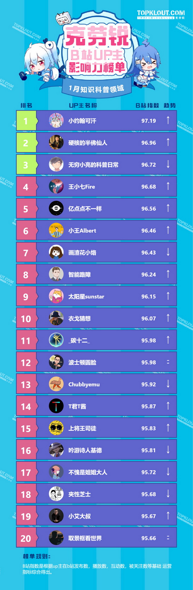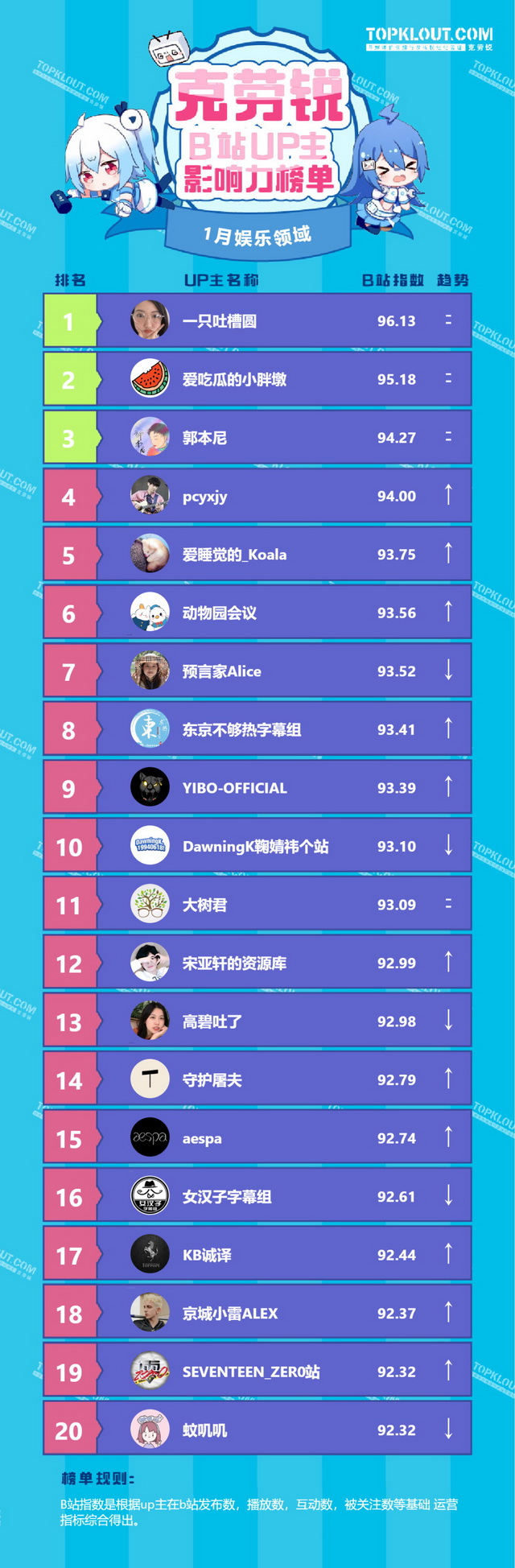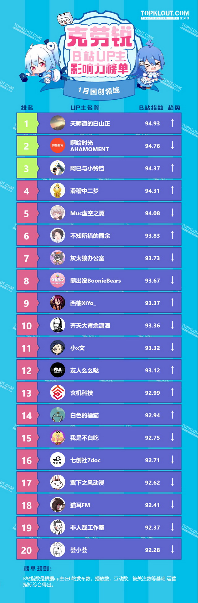 各垂类头部UP主排名依据的是“B站指数”。B站指数是根据每位UP主的内容发布量、播放量、转发量、评论量、收藏量、点赞量、关注量共七个维度综合计算得出的,是客观反映UP主的影响力及营销价值的重要指标。我们来一起看看1月榜单吧!