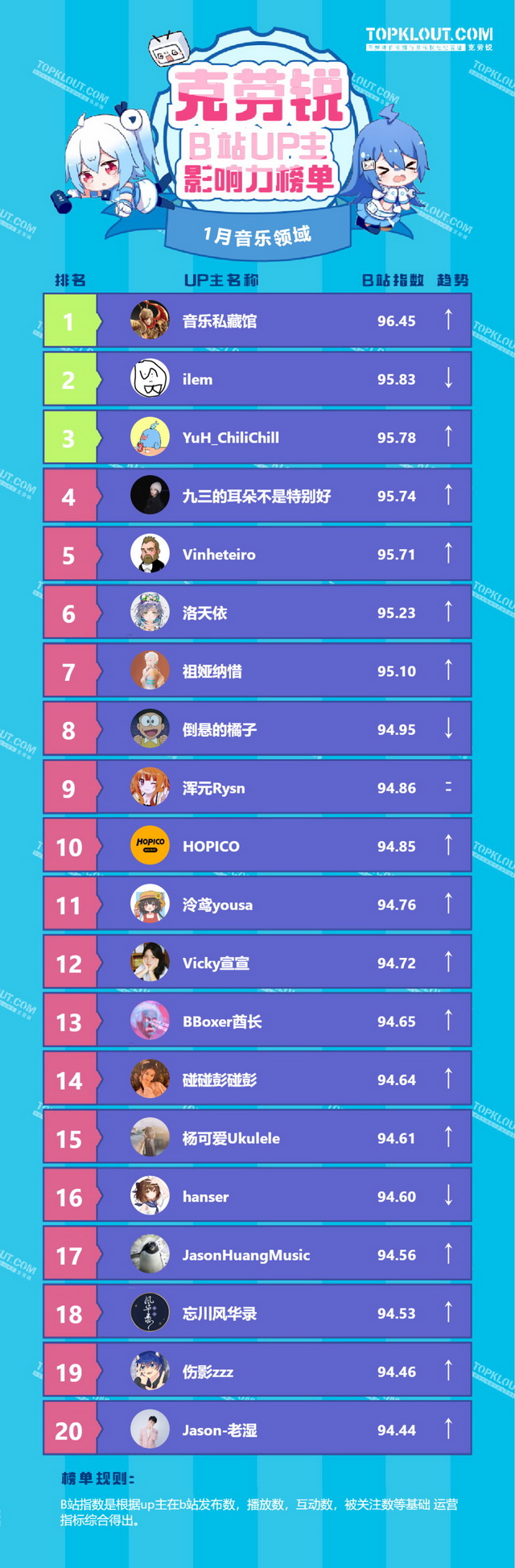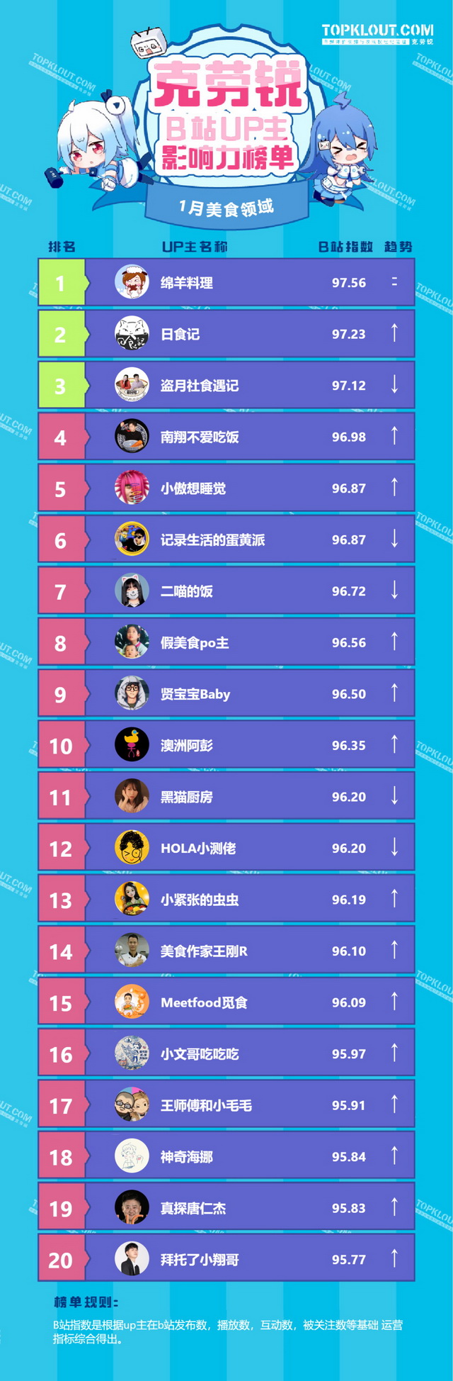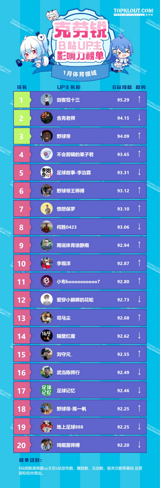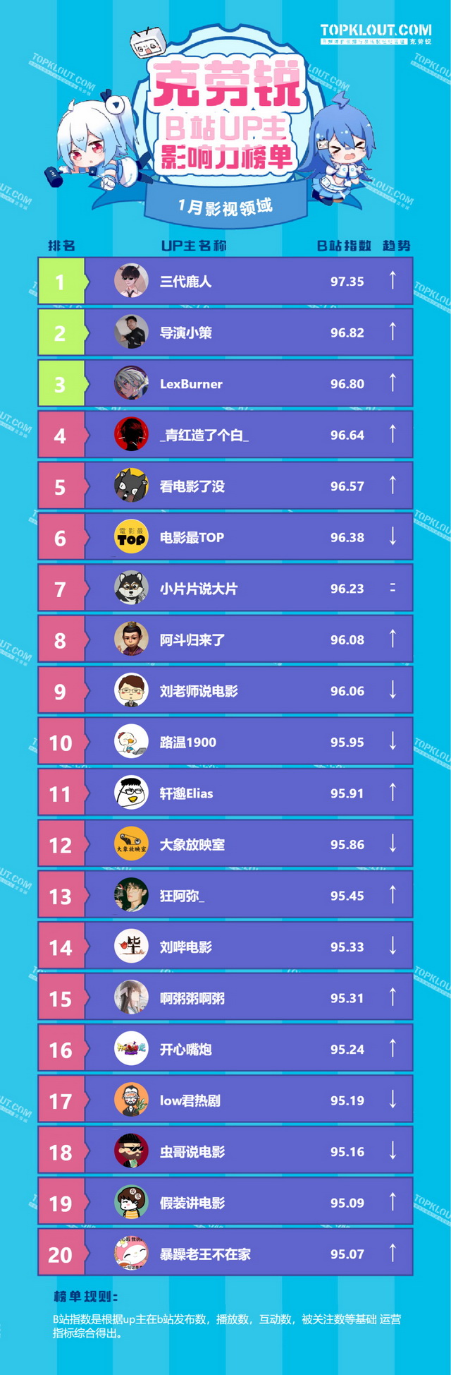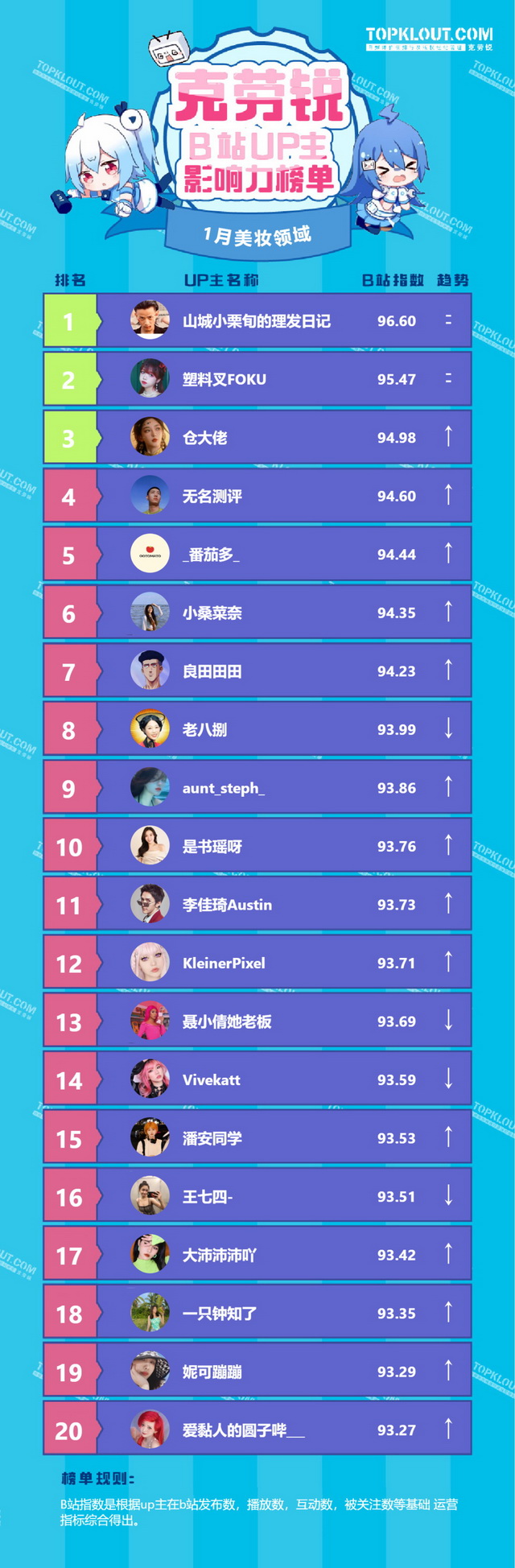 各垂类头部UP主排名依据的是“B站指数”。B站指数是根据每位UP主的内容发布量、播放量、转发量、评论量、收藏量、点赞量、关注量共七个维度综合计算得出的,是客观反映UP主的影响力及营销价值的重要指标。我们来一起看看1月榜单吧!