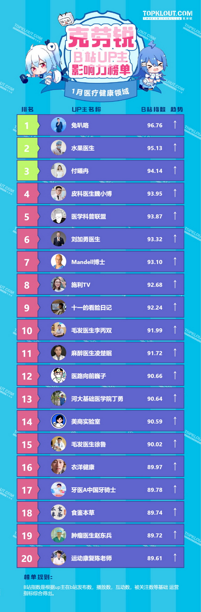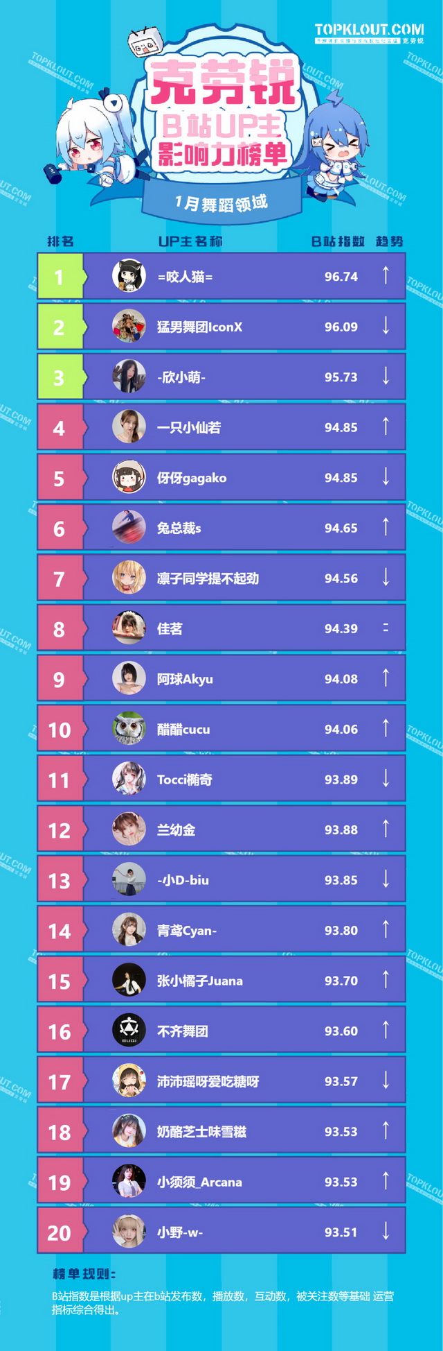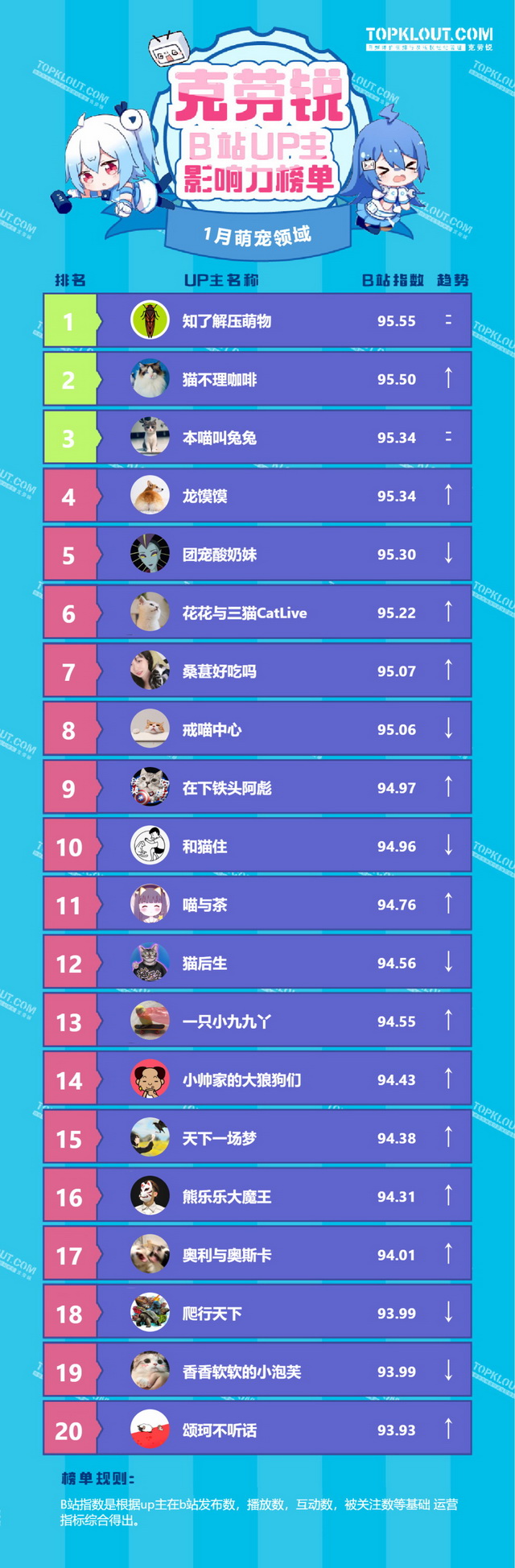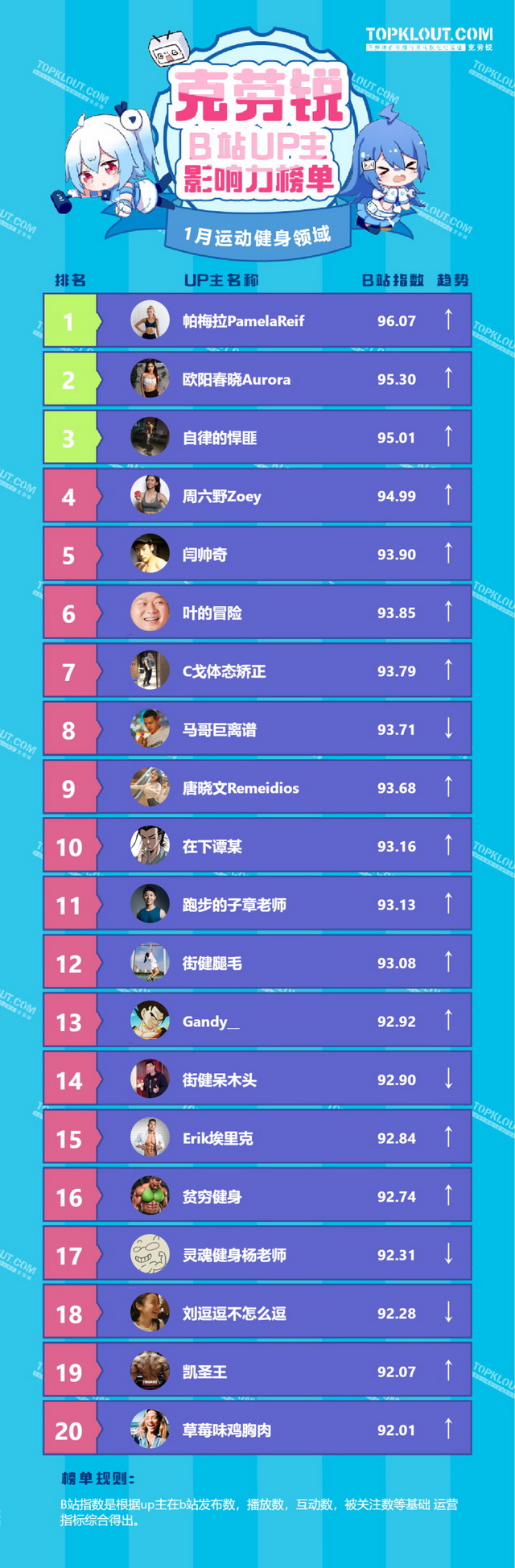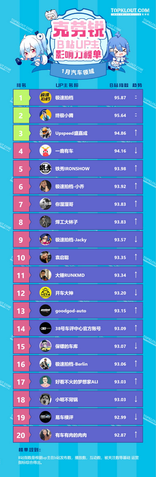 各垂类头部UP主排名依据的是“B站指数”。B站指数是根据每位UP主的内容发布量、播放量、转发量、评论量、收藏量、点赞量、关注量共七个维度综合计算得出的,是客观反映UP主的影响力及营销价值的重要指标。我们来一起看看1月榜单吧!