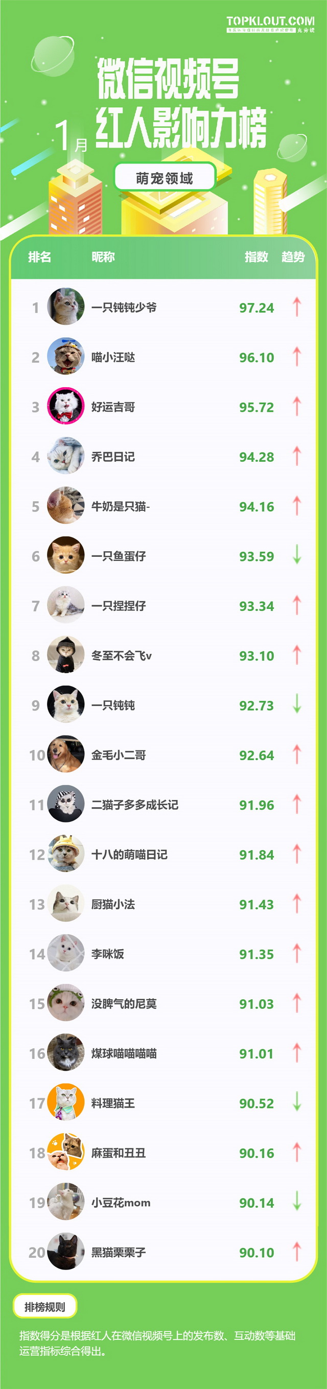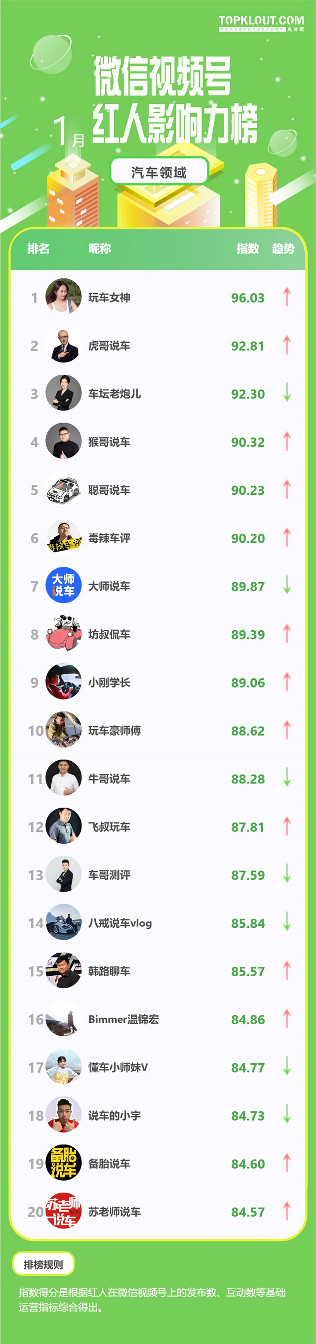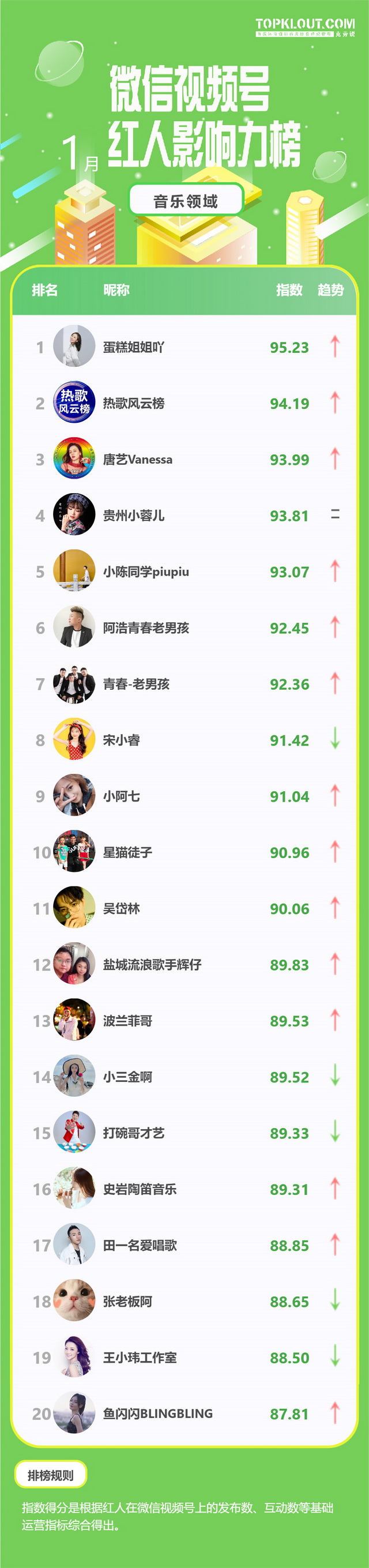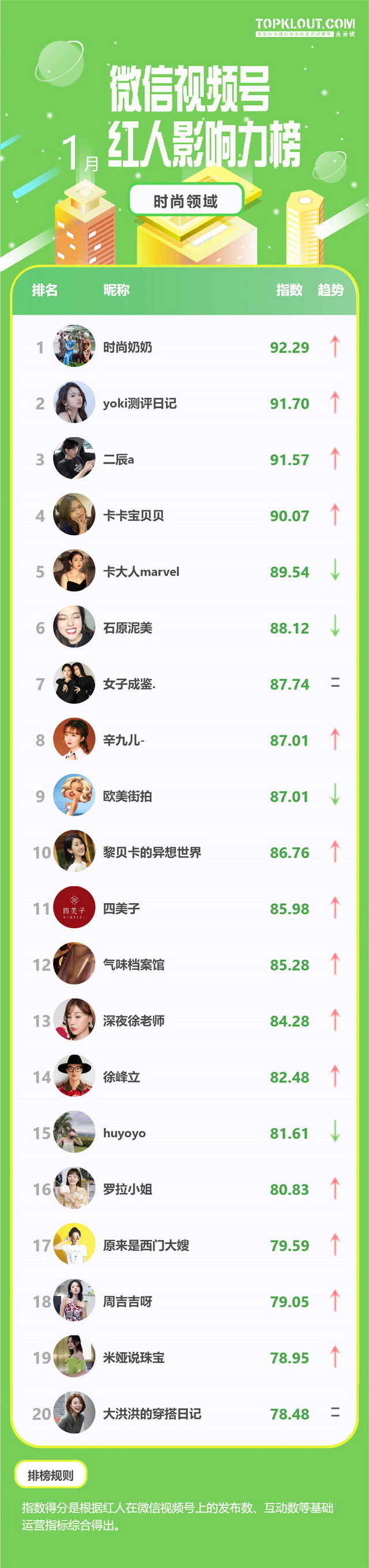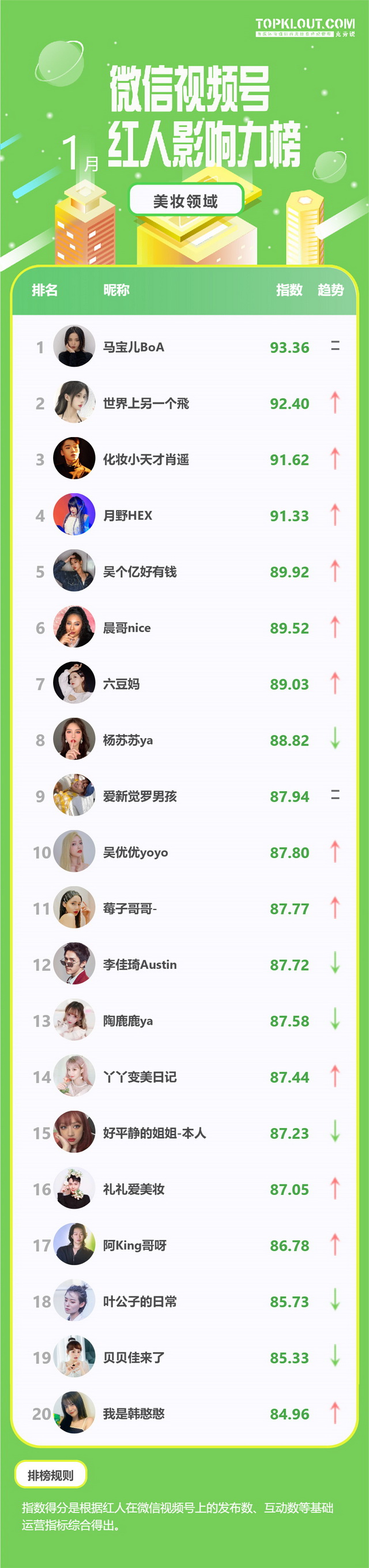 在各大垂类中,哪些红人拥有着较高的影响力?让我们一起来看看1月榜单吧~