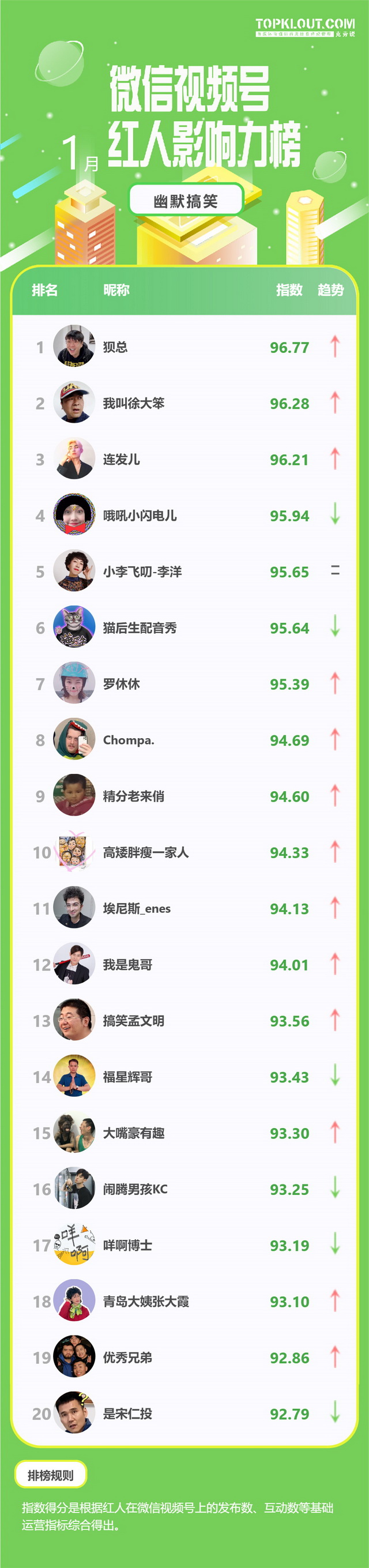 为了发掘更多优质视频号红人,为红人、品牌等角色提供参考,克劳锐推出了《微信视频号红人影响力榜》,根据红人在微信视频号上的内容发布数、互动数等基础运营指标综合排榜,涵盖幽默搞笑、萌宠、美食、游戏、动漫、时尚、音乐、母婴亲子、美妆、汽车这十大垂类。
