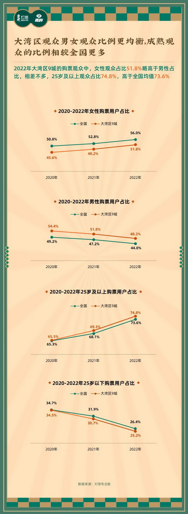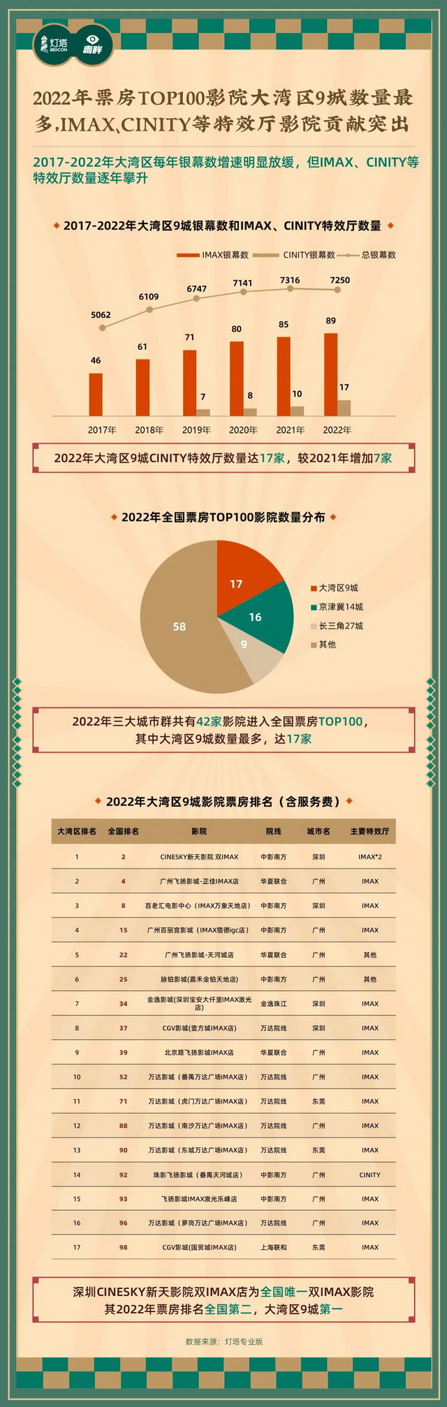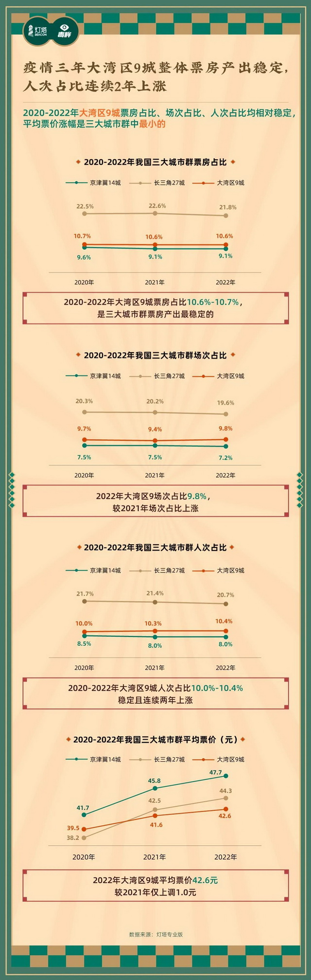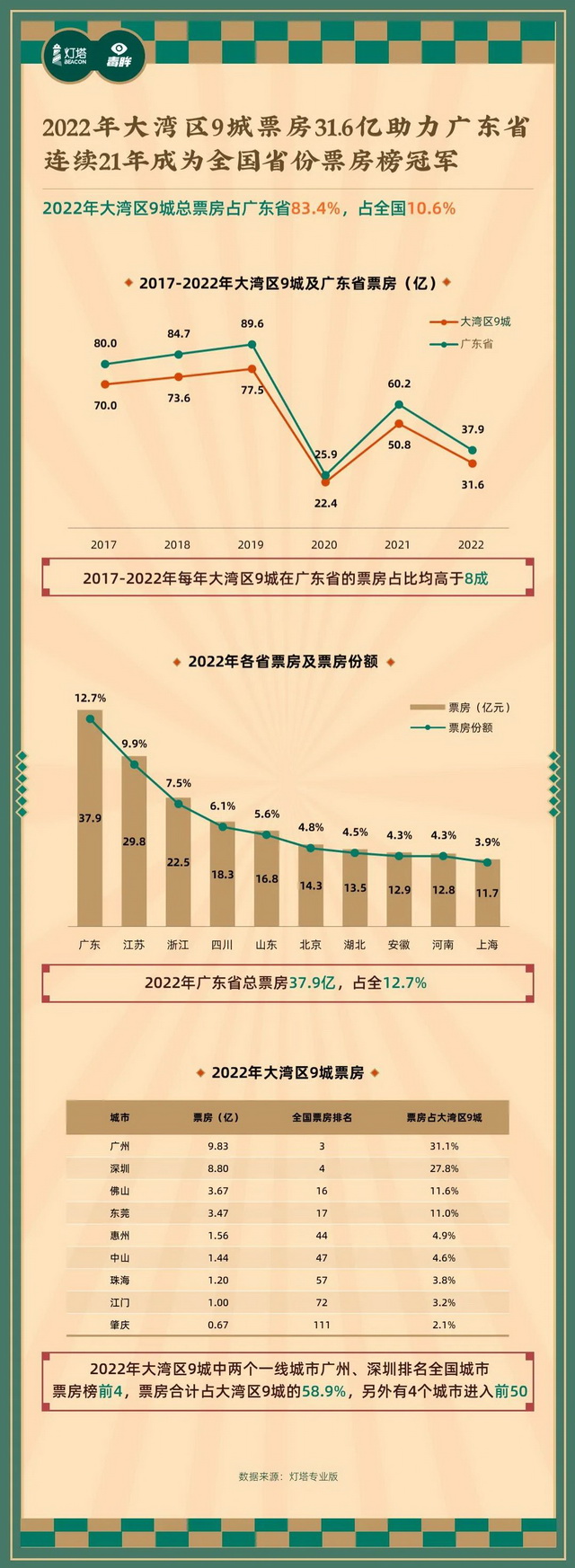 而广东省作为国内最大的票仓所在,已经连续21年稳坐全国省份票房榜冠军,是粤港澳地区的“电影重镇”。灯塔数据显示,2022年广东省总票房37.9亿,占中国电影市场总票房的12.7%,广东省内进入粤港澳大湾区的9个城市又贡献了广东总票房的8成以上。