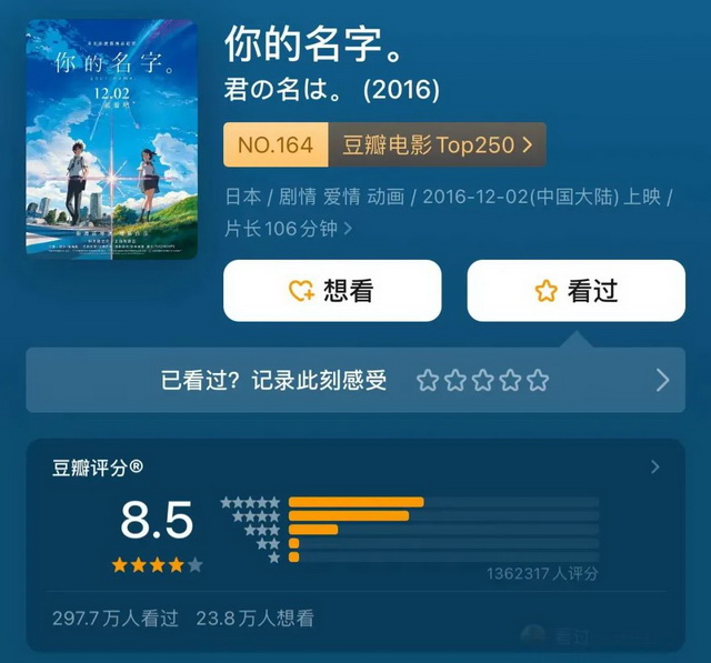 这部电影一举让新海诚的名字从二次元圈内走向圈外——《你的名字。》在中国收获了5.75亿票房,豆瓣有超过136万人打出了8.5的高分。