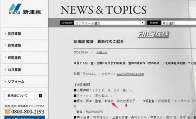 《你的名字。》上映前期,日本长野县历史长达百年的建筑公司新津组,突然在官网上介绍这部动画,并在导演新海诚的名字后面特意加了个标注,“我们社长的儿子”。