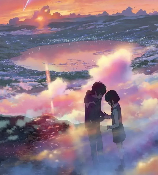 《你的名字。》里泷和三叶在系守湖聚首,背景是灿烂盛大的夕阳,这种大面积的景色片段,几乎都源自于他的童年记忆,“来到东京以后,我常会因为不再发出炫目光芒的夕阳而产生违和感,人们说我的作品爱用极端强烈的色彩来描绘夕阳,这其实是我在少年时代看到的风景残留下的影像。”