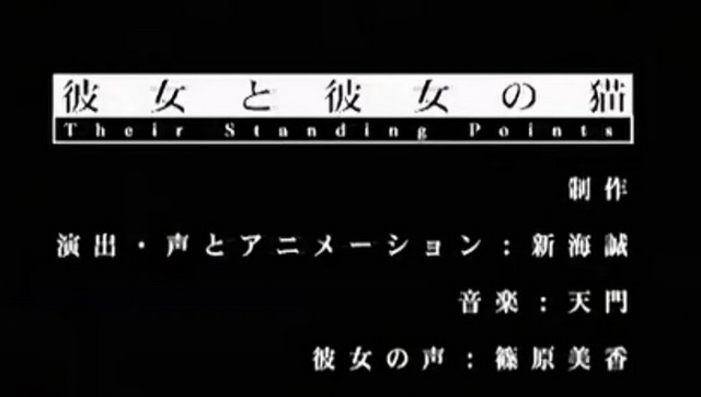 在这一阶段,新海诚开始尝试制作动画,最早是黑白动画短片,2000年时他独立创作的5分钟黑白动画《她和她的猫》问世,拿下了第12回CG动画竞赛大奖赛。同时,Falcom开始着手重点开发游戏《双星物语》,新海诚感到难以兼顾,便辞去了Falcom的工作。