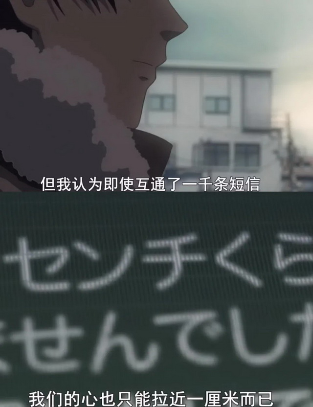 新海诚第一部真正意义上的彩色动画《星之声》结尾处,男女主的声线在这一句话中逐渐重叠:“我们虽然距离彼此很远很远,但是思念说不定可以超越时间与距离。”