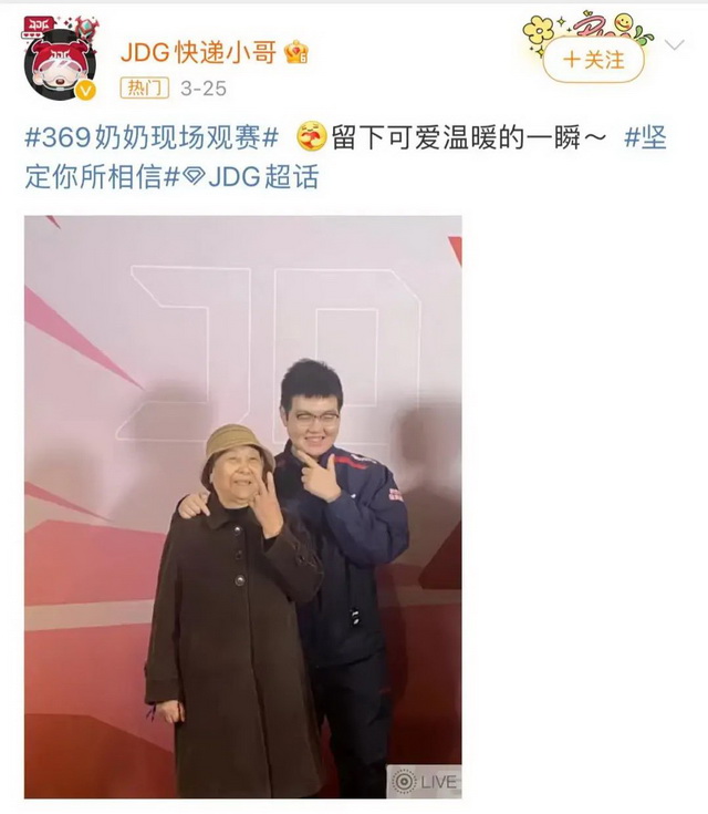 在电竞选手登上微博之夜喜提热搜之时,还有一个故事,也收获了抖音、微博、B站等多个平台的热搜。在LPL战队JDG常规赛收官战这天,选手369把奶奶接到了比赛现场。从小作为留守儿童的他,被奶奶抚养长大,本来打算读汽修专业当个汽修工,机缘巧合之下打了电竞,如今也成为国产顶尖上单选手。