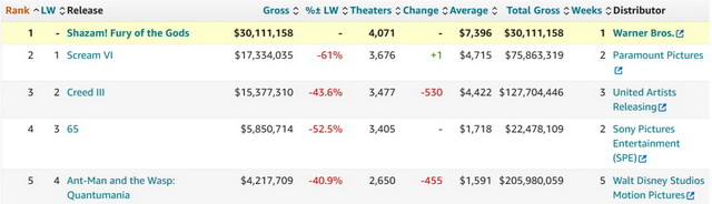 据The-Numbers统计,《雷霆沙赞2》在提前场就只进账了340万美元,远低于第一部的923万美元。铺开至北美4071家影院后,《雷霆沙赞2》首日(含零点)拿下1170万美元,接下来两天分别下跌6%和33%,周末票房报收于3011万美元,单馆收益为7397美元。