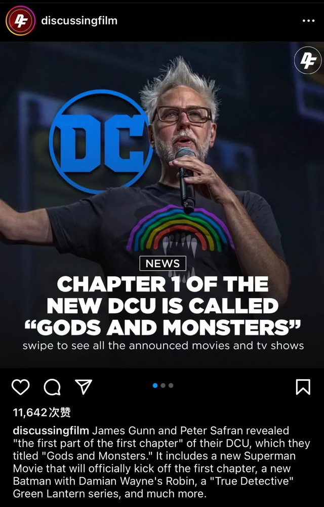 今年1月,詹姆斯·古恩宣布“DC扩展宇宙”将迎来重启,统合后的新”DC宇宙“将以2025年公映的《超人:传承》为开端,包括《权力战队》、《蝙蝠侠:英勇无畏》、《超级少女》和《沼泽怪物》等院线电影,以及专供HBO Max的《生物突击队》、《沃勒》、《金色先锋》、《绿灯侠》和《天堂岛陷落》等剧集。这10个项目将组成”DC宇宙“的第一章"诸神与怪兽",而马特·里夫斯执导的《新蝙蝠侠2》仍将独立存在。