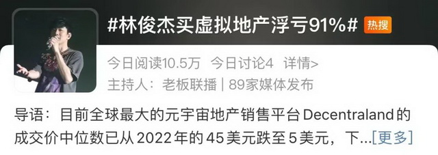 已经从舆论场中消失很久的元宇宙,最新的一条消息,是林俊杰的元宇宙房产投资大跌了91%。