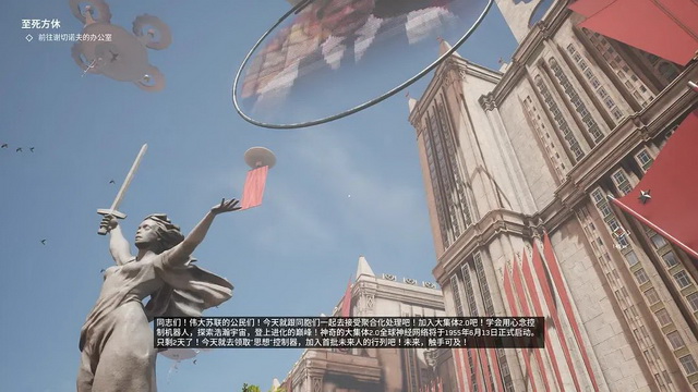 对电子游戏而言,“综合性”很容易被感知到。《原子之心》就在美术、建筑、雕塑等很多方面做到了极致,基于冷战背景、原子能技术发展、苏联未来主义的设定,游戏搭建了一套高度统一的视觉美学体系,并在游戏开场就观光式地呈现给了玩家,而这样从社会风貌到物件细节都有浓厚“苏联味”的作品放在整个游戏史上都罕见,已经可以算种“艺术创新”。