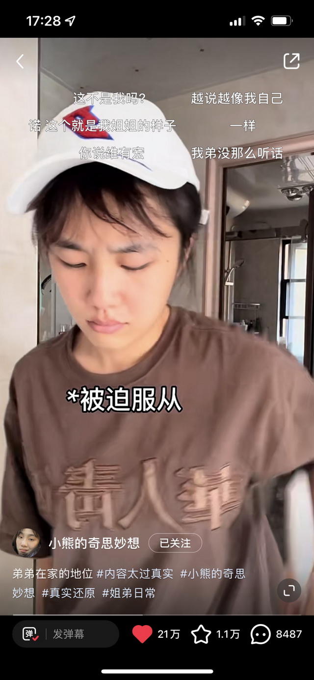 在视频的最后,妈妈让姐弟二人洗碗,正要出门的姐姐直接命令弟弟去洗碗,结果弟弟硬气的反驳道,“我不去,每次都是我去”,结果姐姐大声对他吼“你去不去!”,弟弟感到害怕只好无奈的去洗碗,只不过用力刷表示自己的不满,而姐姐看到后把包使劲放在桌子上威慑他,弟弟气急败坏但又很无奈,只好轻拿轻放。而评论区的网友表示“这不就是我指挥弟弟的模样嘛”,可见@小熊的奇思妙想 属实把“家庭弟位”拿捏到位了。
