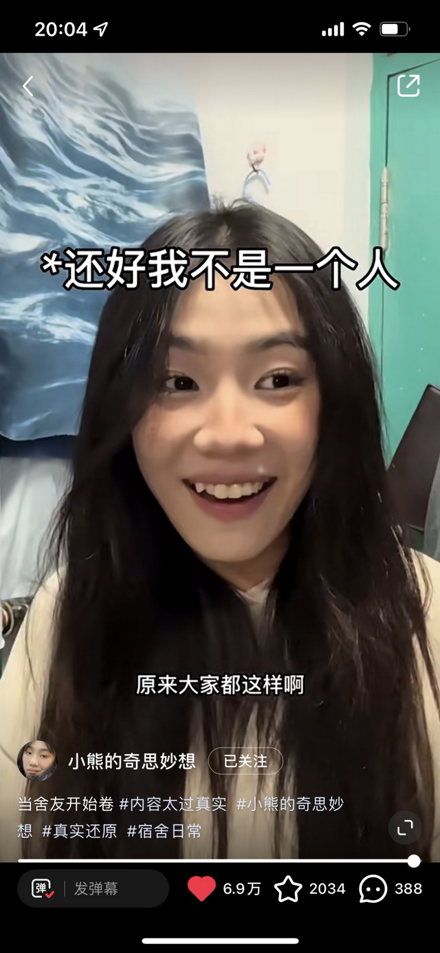 在@小熊的奇思妙想 的视频中,女生宿舍并不是外界想象的勾心斗角,相反,她与室友之间的相处十分融洽,就像朋友那般。