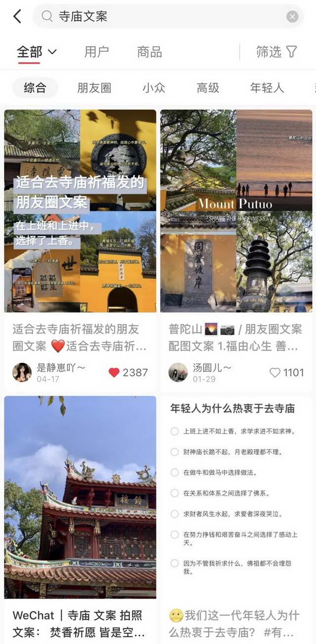 就比如搜索“寺庙文案”,@是静崽呀~的笔记获得千赞,其中“黄墙灰瓦,红绸祈福,皆是空山心亦静”,“我举高香敬神明,抵我心中意难平”,“一方净土,三柱清香”,“所念皆所愿,所求皆所得”给用户提供了灵感。