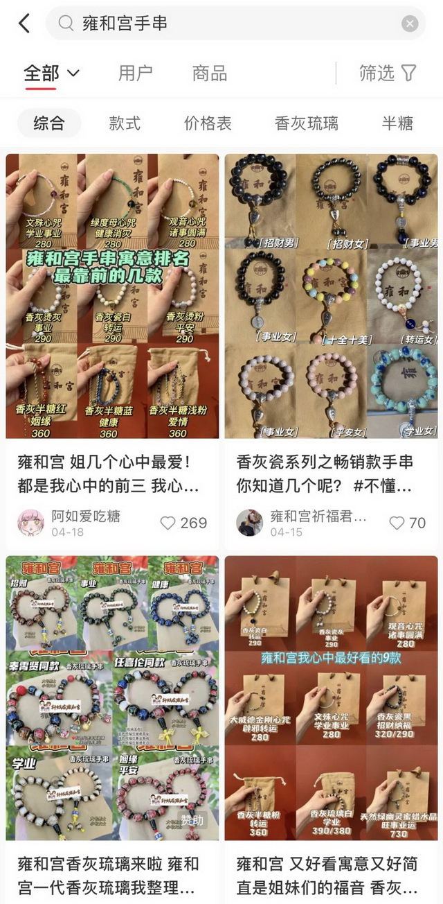 其中雍和宫手串凭借较高的颜值以及玄学加持在社交平台的热度居高不下,仅仅在小红书就有4万+笔记,“雍和宫手串款式”、“雍和宫手串佩戴禁忌”、“雍和宫手串价格表”等均是相关词条,由于一串难求,甚至还催生了帮别人代求的生意。