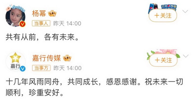 杨幂更换了多年以来的微博头像,发文:“共有从前,各有未来。”嘉行传媒发布微博祝杨幂“未来一切顺利”,并迅速地删除了公司发布的艺人年终总结里杨幂的图片。