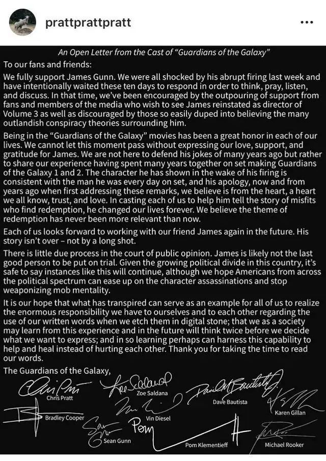 2018年,古恩早年间的推文被翻出,他被指控拿恋童癖和强奸开玩笑。迪士尼高层当即决定,解雇古恩并暂停《银河护卫队3》的开发。几天后,星爵的扮演者普拉特领导了《银河护卫队》几乎所有主演发布联名信,与导演古恩共进退,试图劝说迪士尼重新召回古恩。