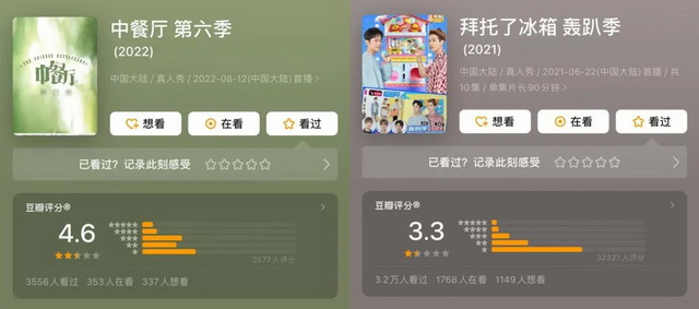 结果,观众大多不适应节奏的突然转变,就算凭借热搜话题获得了一时热度,也很难支撑完一整季,并且极度损害节目口碑——《中餐厅》前两季的豆瓣评分还在6分以上,第三季就直接滑落到了4.8分。同样有此方面遭遇的还有《拜托了冰箱》,节目在第七季渴望通过节目创新发生转变,结果是被愤怒的观众将评分打到了3.3分。