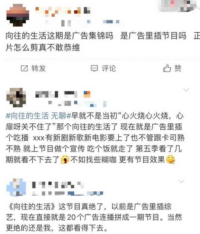 《向往的生活》曾经是综艺节目“吸金”的代名词,因为节目气质平缓、生活气息浓厚、露出机会多等等原因,《向往的生活》一度是平台们艳羡的“赚钱综艺”,单季赞助费也传出过8亿、15亿等令人咋舌的数字。与此对应,在最巅峰时期,《向往的生活》被部分观众嫌弃广告太多,是“广告里面插播节目”。