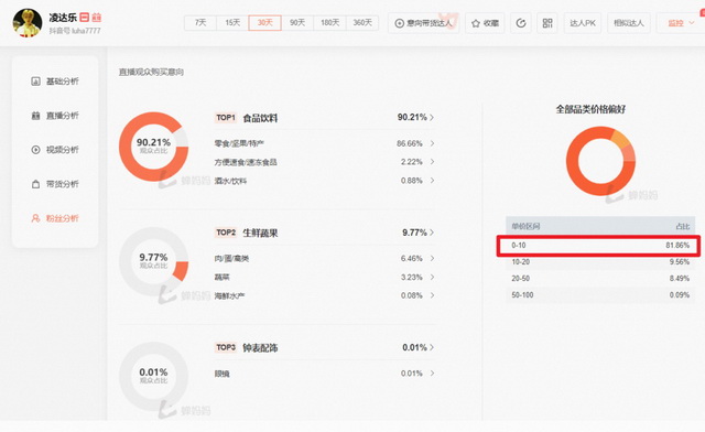 一个巧妙的安排在于,鹿哈每天开播的时间都放在晚上11点,错开了大主播开播的黄金时间,每场直播的流量保持在300万左右的场观人次。后半夜开播,让流量更为集中,这也是他能登上抖音总榜第二的原因,抖音带货榜会根据商家热度,每小时更新一次。而在带货品类上,就像网友吐槽“每次刷到他直播都在吃奶枣”“每次刷到他直播都在吃竹笋”,鹿哈带货的商品超90%都是食品饮料,且紧抓“便宜”这一核心,81.86%商品价格在10元以内。