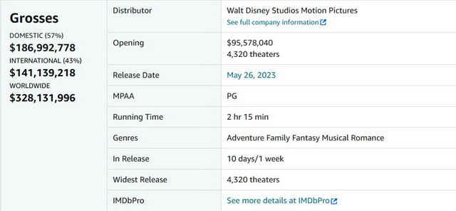 据The-Numbers统计,《小美人鱼》在提前场共进账1030万美元,为第67部零点票房破千万美元的电影。细分来看,《小美人鱼》在周四晚间拿到945万美元,余下则为周四特别放映场次的收益,后一个数字高于2019年的真人版《阿拉丁》(7百万美元)。