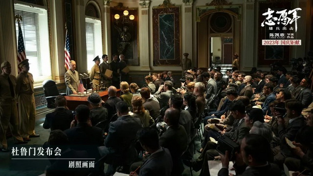 影片美术指导陆苇在现场分享了几张剧照,从中就能管窥剧组筹备工作之细致。比如影片中美军决策的场景为艾森豪威尔行政大楼,本来这一地点往常应该是在白宫,但正好1950年1月的时候白宫装修,因此杜鲁门将记者会迁移到艾森豪威尔行政大楼举行。