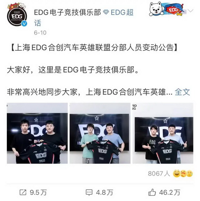 6月10日下午3点,EDG电子竞技俱乐部官宣Uzi加盟,这条微博被转发超过9万次。