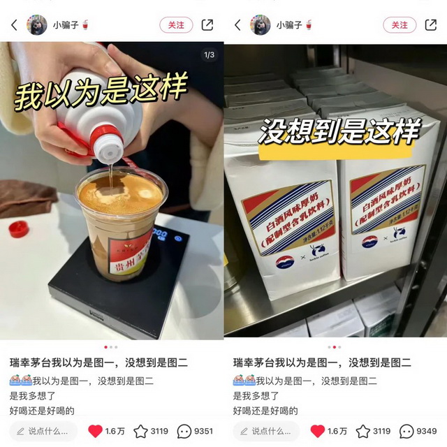 除了口味上的争议,酱香拿铁的“含茅量”也颇受年轻人关注。按照消费者的理解,既然添加了真茅台,“酱香拿铁”的做法应是将茅台酒直接注入瑞幸咖啡中,然而实际情况却是加入含有53度飞天茅台的白酒风味厚奶。
