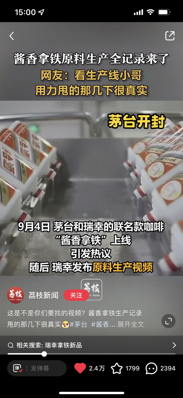 9月5日该联名还在继续,从社交热度来看,“酱香拿铁”的线上线下讨论度明显下降,“酱香拿铁”之所以火爆,更多的是满足了年轻人的好奇心,其热度很难持续。不过通过本次联名,茅台品类进阶引发广泛关注,也为后续品类扩张做了铺垫。