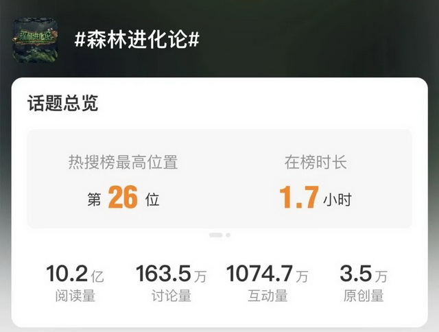 在《森林进化论》播出之后,节目拿下了9.2的豆瓣高分和近3000条短评,#森林进化论#微博话题阅读量突破10亿。
