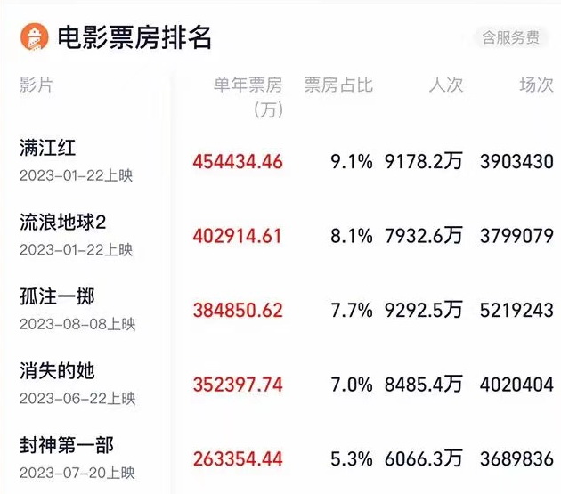 2023春节档,诞生了两部超过40亿票房的作品,分别是45.44亿的《满江红》与40.29亿的《流浪地球2》,这两部电影也基本上将成为今年年度票房的头两名;而今年的暑期档更是创造了暑期档历史总票房的纪录,诞生了《孤注一掷》《消失的她》《封神第一部》三部票房超过25亿的作品。