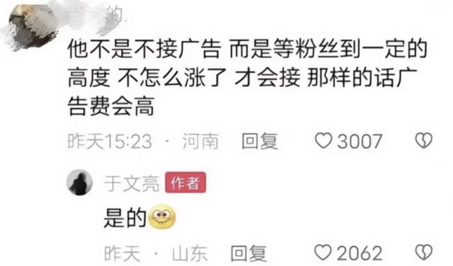 例如,于文亮表示,自己可以“把心里话说出来,直播就是为了圈钱”;当网友表示“他不是不接广告,等粉丝到了一定高度不怎么涨了,才会接,那样的话广告费会高”时,于文亮回复“是的”;直播间观众建议关掉礼物和打赏,于文亮也并未采纳。