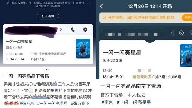 电影博主@电影温特 整理了“下雪场”相关讯息发布在微博,不久,“下雪场”的消息热度逐渐上升,社交媒体讨论越来越多。不少观众专门给影院打电话询问是否有“下雪场”,“电话都打爆了”。