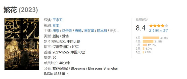 然而,随着剧情逐渐铺展开,舆论场上的质疑声逐渐减弱。当每个人物都逐渐立体后,王家卫的风格反而为情感关系赋予了某种“高级感”。《繁花》的豆瓣评分从8.1一路涨到8.3,并在完结后又升到8.4分。