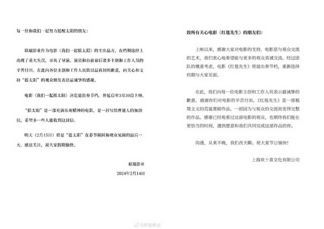 《我们一起摇太阳》《红毯先生》宣布延期上映
