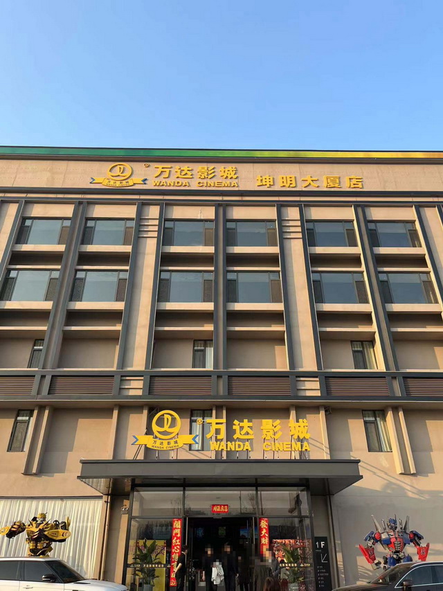 在北二路和太行山路的交叉口,独栋的万达影城坤明大厦店屹立在黑夜之中,远远就能看到建筑侧墙的彩色Logo。
