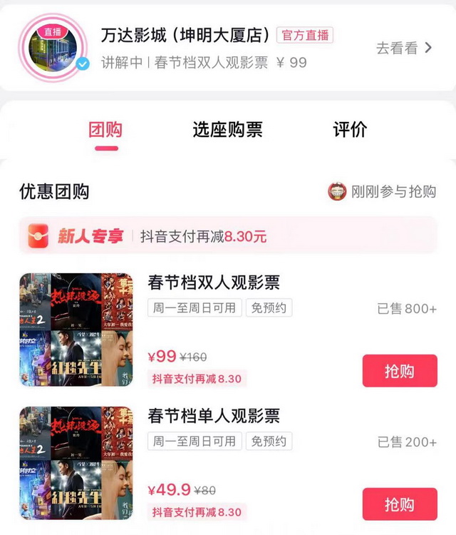 武店长介绍道,因为密钥下来的时间比较迟,他们是在前一天连夜开会决定元旦开业的,为了在短时间内做好宣传,他们联系了当地100位抖音网红进行宣传,同时,在抖音上线套餐:100块两人包场或者单人19.9等优惠活动。开业当天,影院客流量达到800多人。