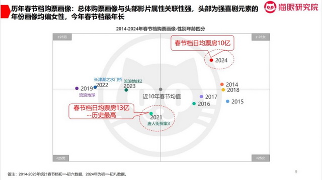 只不过,总体上还是那个老生常谈的问题,今年的春节档供给太过偏重喜剧类型,导致观众少有差异化选择。如果结合历年春节档购票画像来看,今年是高龄女性区间偏重度最高的一年,年轻观众和男性观众的购票潜力被忽视。某种程度上,这或许也是节后《周处除三害》得以大爆的“天时”之一。