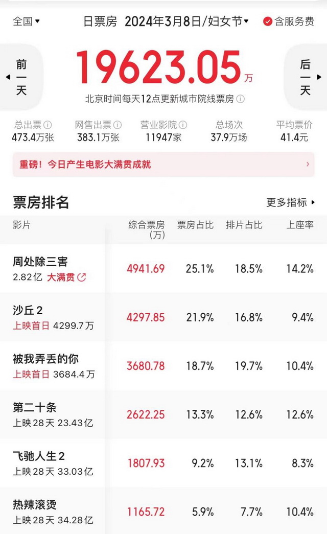 以今年为例,作为席卷全球票房的重磅大作《沙丘2》,内地上映首日排片占比甚至不如《被我弄丢的你》,足见影院对进口片的看衰程度。票房日冠更是持续被已经上映一周的《周处除三害》所霸占,《沙丘2》一天都没拿到。