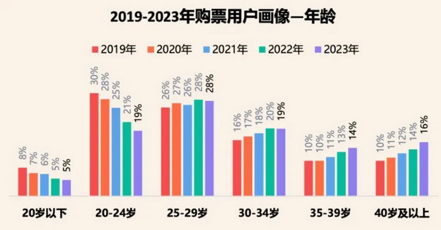 2023年内地全年观影人次达12.99亿,创近4年来观影人数新高,但是观影群体结构发生了很大的变化。根据灯塔《2023中国电影市场年度盘点报告》显示,25岁以下观众自疫情之后呈现持续下降的趋势,25-29岁市场主力观众占比稳定,30岁及以上成熟群体占比连年上涨。