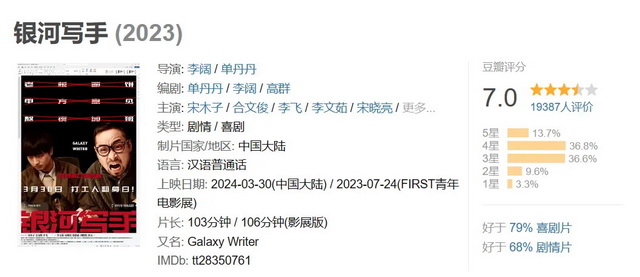 3月30日,电影全国上映,没能延续在电影节中的强势表现,目前票房416万,豆瓣评分从开分的7.3滑落至7.0。